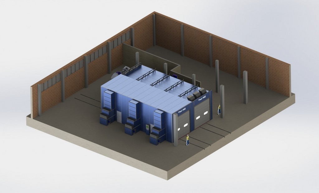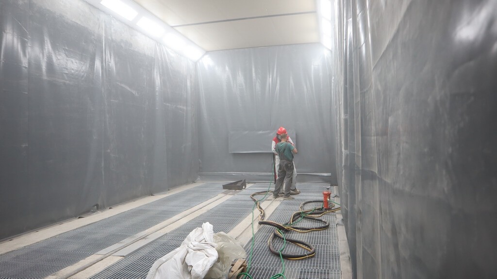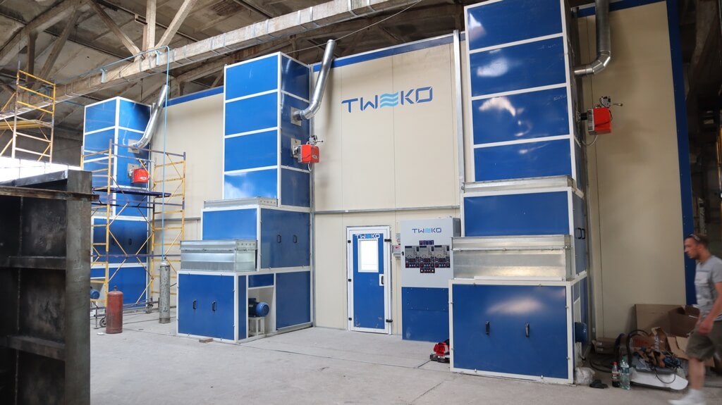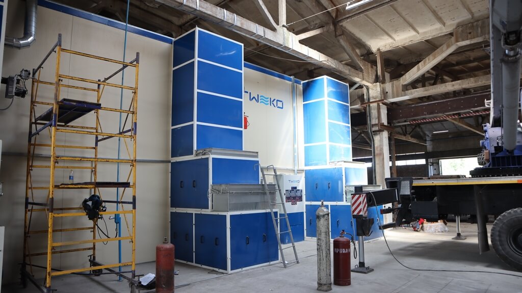 Камера фарбувально-сушильна (КФС) має два основні режими роботи – фарбування та сушіння, з температурними режимами роботи 18-24 С та 20-70 С відповідно. Камера прохідного типу, має внутрішній розмір робочої зони 15х5х5м (ДхШхВ), в торцевих стінах встановлені два комплекти секційного воріт типу з автоматичним приводом. Повітря підігрівається за допомогою трьох продуктивних газових пальників, потужністю до 350 кВт кожна та теплообмінників з нержавіючої сталі, розроблених та виготовлених нашою компанією спеціально для фарбувальних камер. За освітлення в камері для фарбування відповідають два бічних і два стельові ряди високоефективних чотирилампових світлодіодних світильників, при цьому рівень освітленості всередині камери не менше 900 люкс.