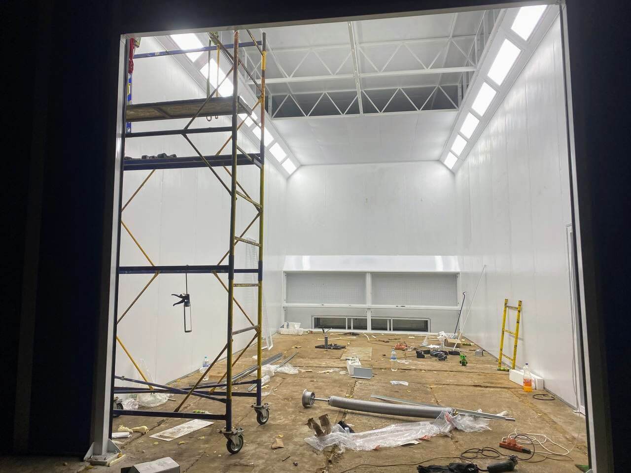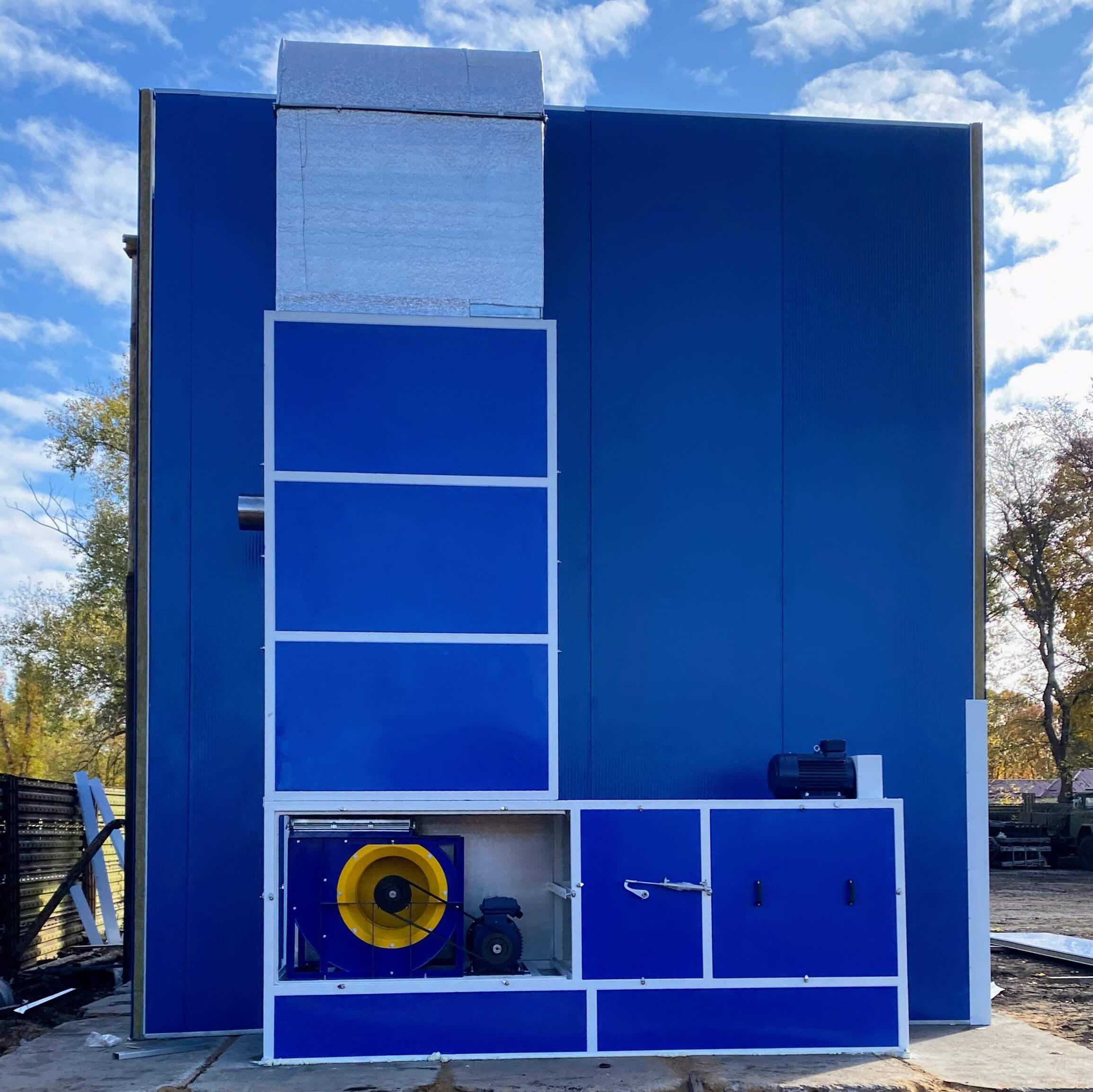 Камера оснащена дизельним пальником, системою витяжної вентиляції з фільтрацією повітря, стельовим освітленням (не менше 800 люкс) і максимальною потужністю до 250 кВт. Для безпеки встановлено протипожежний клапан, а корпус виготовлено з негорючих панелей товщиною 50 мм із сертифікатами пожежної безпеки. Камера має тупикову кабіну з воротами 4000×4000 мм, двері для персоналу, комплекти припливних і викидних повітропроводів та димохід. Повітропроводи виведено через віконні отвори, що зменшило витрати на монтаж.