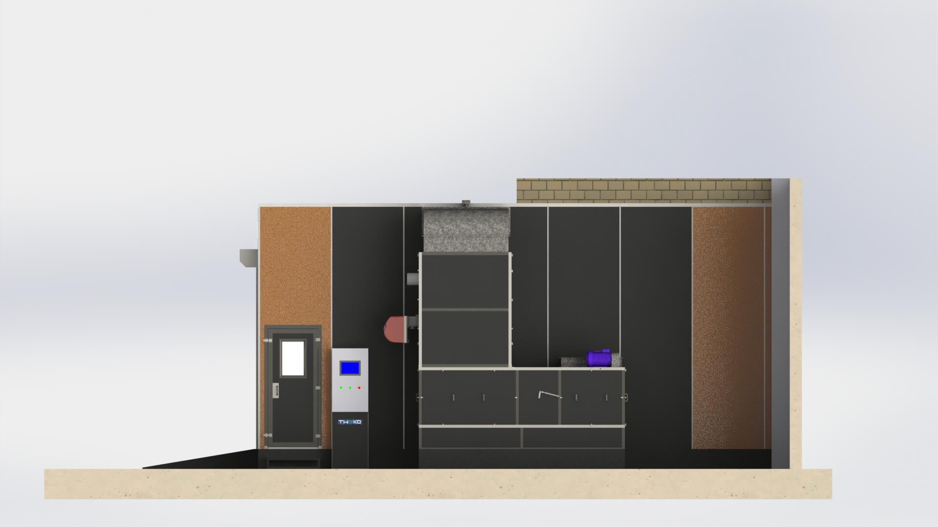 Режим рециркуляції повітря під час сушіння зменшує витрати енергії при збереженні стабільного температурного режиму. Індивідуальна компоновка забезпечила інтеграцію камери в існуюче приміщення без зміни загальної структури цеху.