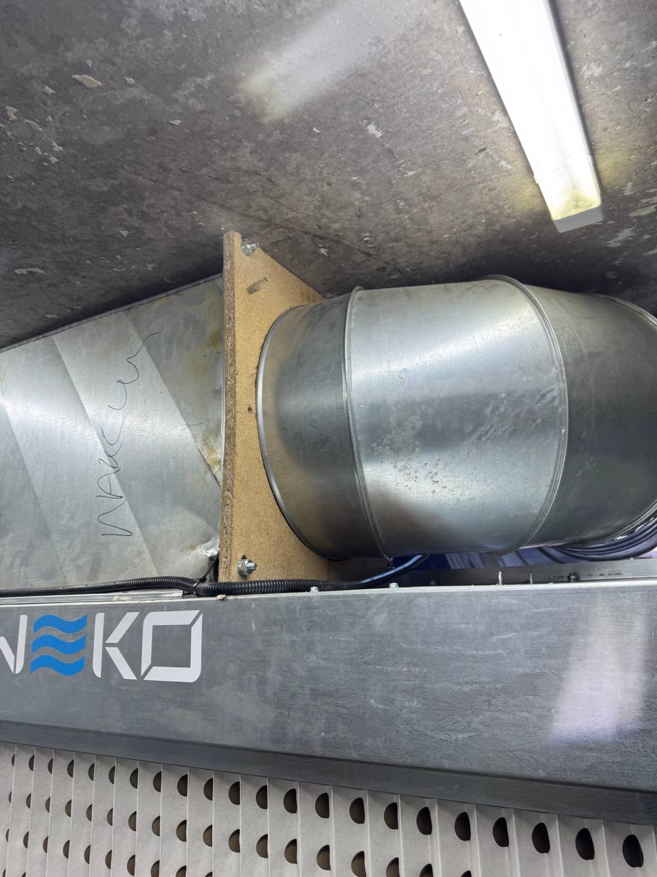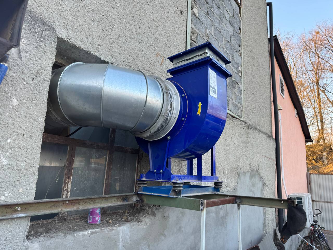 Для забезпечення ефективної роботи фарбувальної камери ASS-Comp-2 у компактному приміщенні KozakWorkshop команда TWEKO організувала вивід повітроводів через зовнішню стіну майстерні. Вентиляційна система була встановлена на металевій платформі, закріпленій на стіні, що дозволило оптимально розташувати обладнання та забезпечити безперебійне виведення відпрацьованого повітря. Спеціально підготовлений отвір у стіні з металевою окантовкою гарантує герметичність і захист від зовнішніх впливів, а продуктивність системи у 6500 м³/год забезпечує швидке очищення повітря від шкідливих частинок, створюючи безпечні умови для роботи майстрів.