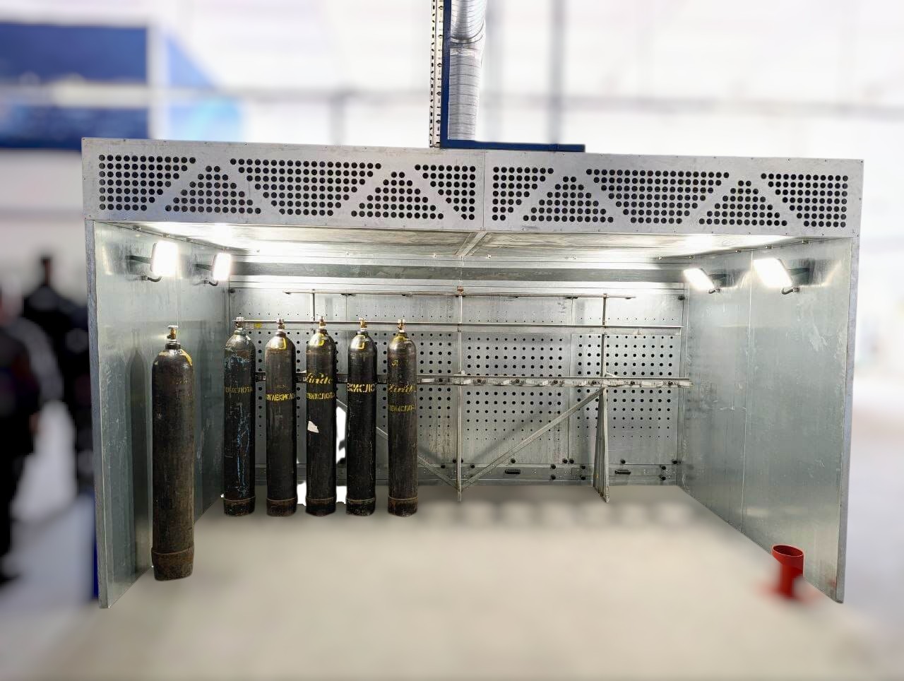 | Фарбувальна камера ASS-Cabin-2 | Контрольоване фарбування балонів. Дворівнева суха фільтрація (лабіринтний + PaintStop, ≥95%, EU4), викид через повітропровід D560 мм на дах (отвір Ø ≈1,1 м). |