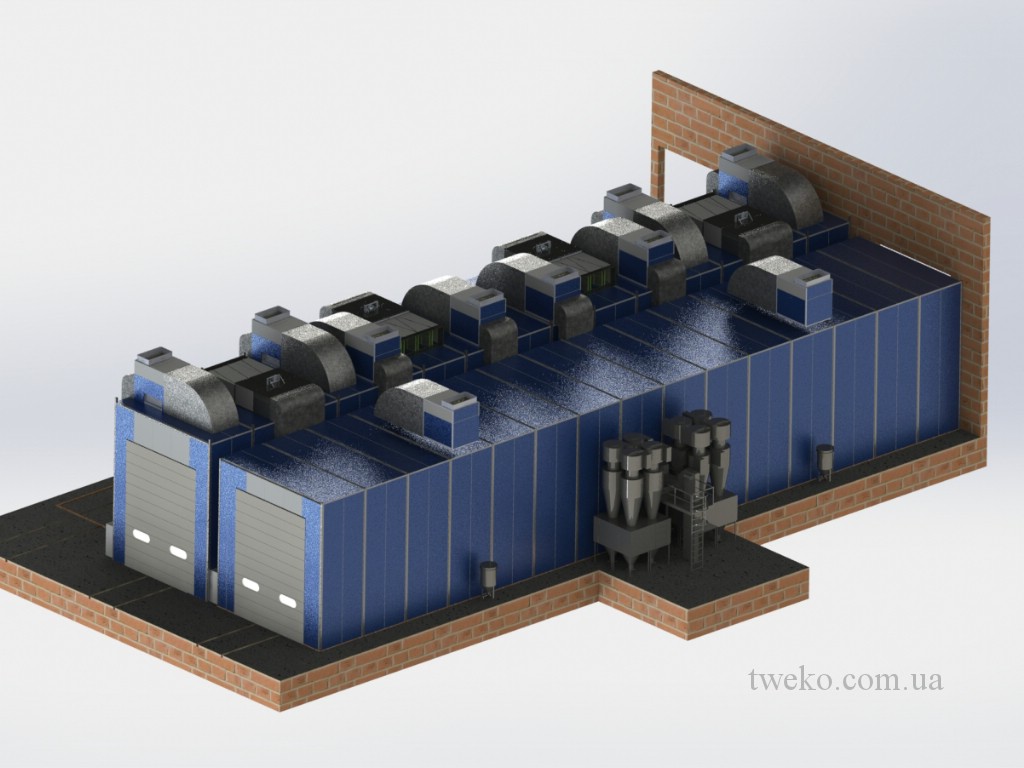 Кабины камер располагаются впритык друг к другу и помимо входных ворот имеют одни общие, благодаря чему окрашенное изделие имеет возможность попадать после покраски сразу в сушку. Перед данными манипуляциями может понадобится очистка изделия в дробеструйной камере.