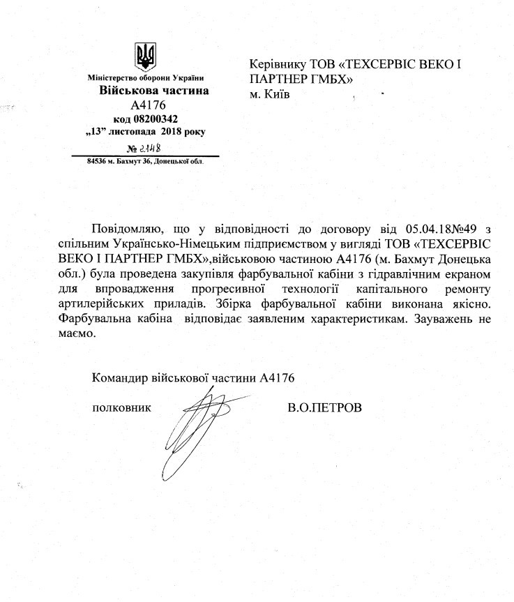 В 2018 году ООО «Техсервис ВЕКО и партнер ГмбХ» успешно реализовало проект для военной части А4176 Министерства обороны Украины. Согласно договору от 5 апреля, мы изготовили и поставили покрасочную кабину с гидроэкраном, предназначенную для капитального ремонта артиллерийских приборов. Оборудование полностью соответствует техническим требованиям, о чем свидетельствует положительный отзыв заказчика о качестве выполненных работ.