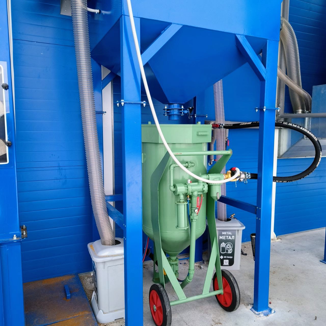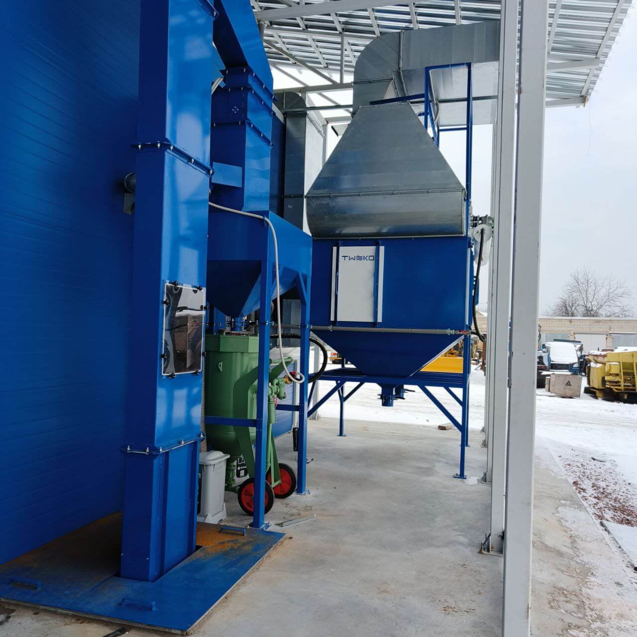 - Механизированной системой сбора и регенерации абразива с замкнутым циклом, в состав которой входят скребковый пол, ковшовый элеватор, вибрационный сепаратор и бункер-накопитель для повторного использования абразива.
