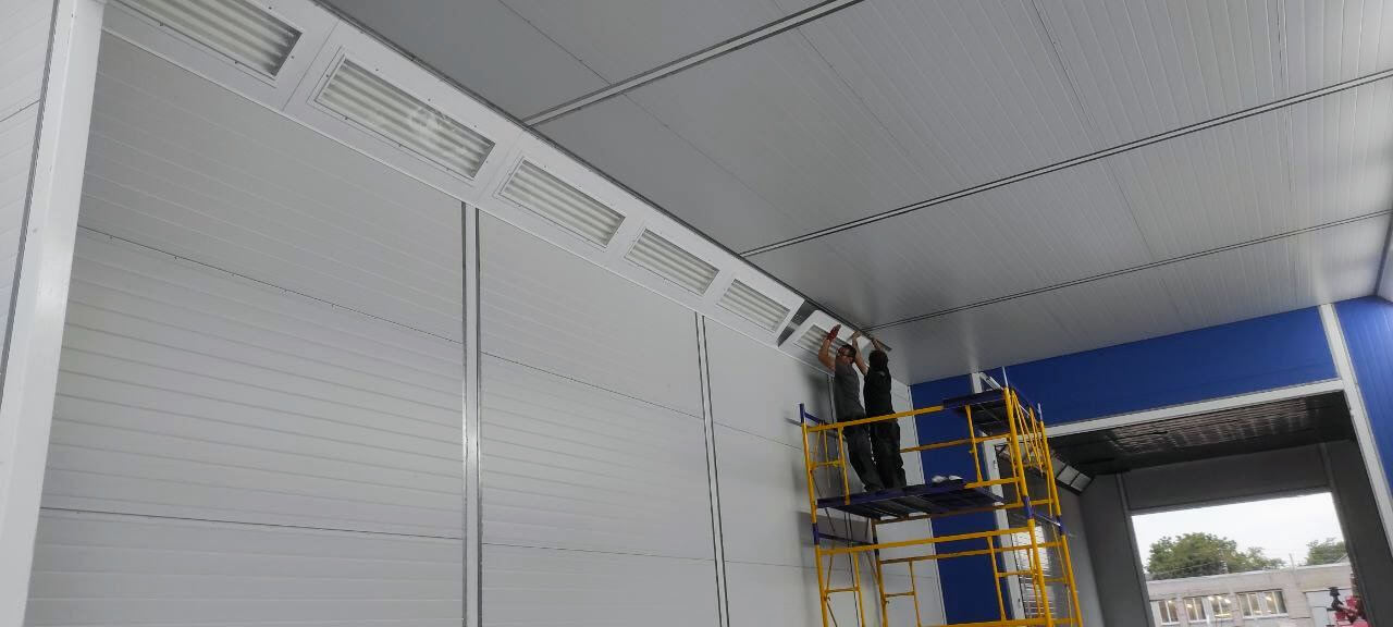 - Приточно-вытяжной вентиляционной системой с организованным воздухообменом, обеспечивающей равномерное распределение воздуха в рабочих зонах во время окраски и эффективный отвод аэрозолей лакокрасочных материалов.
