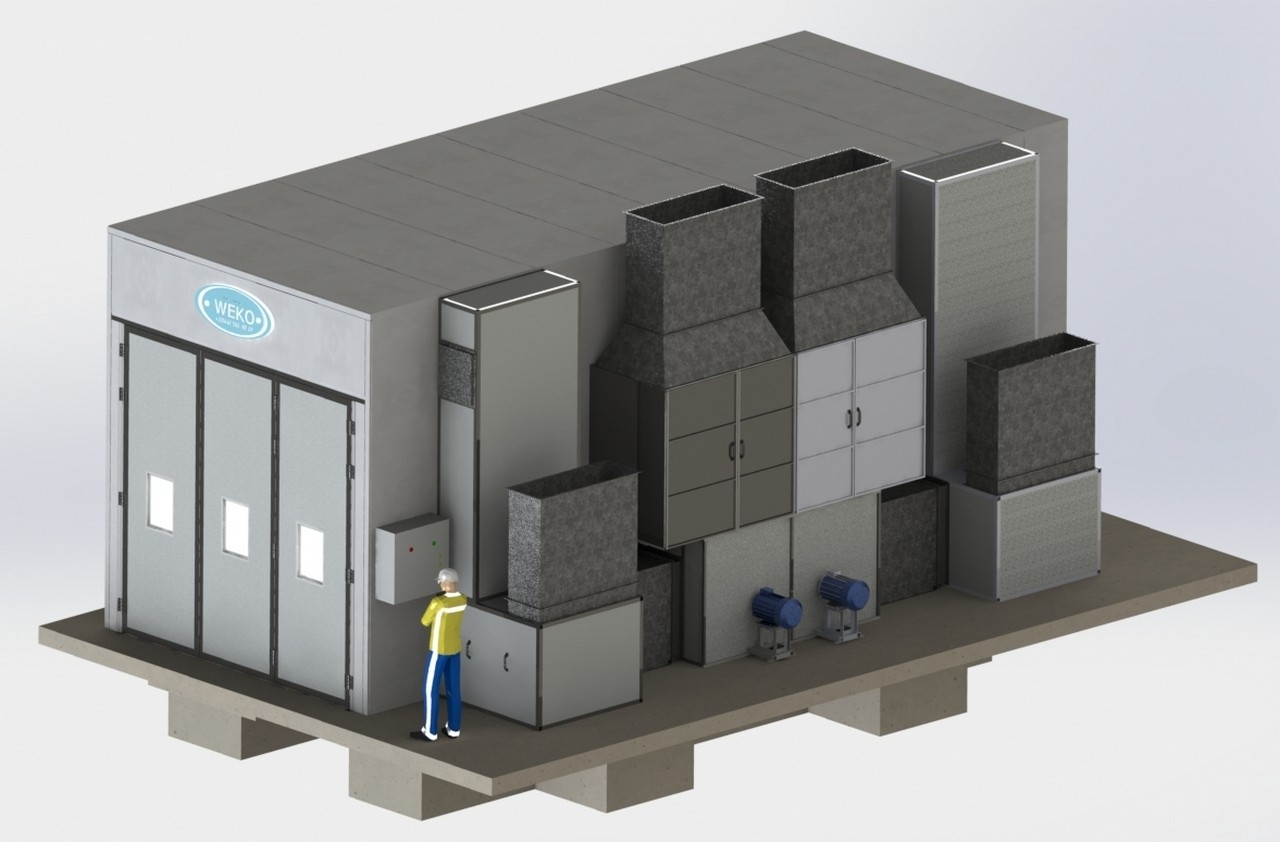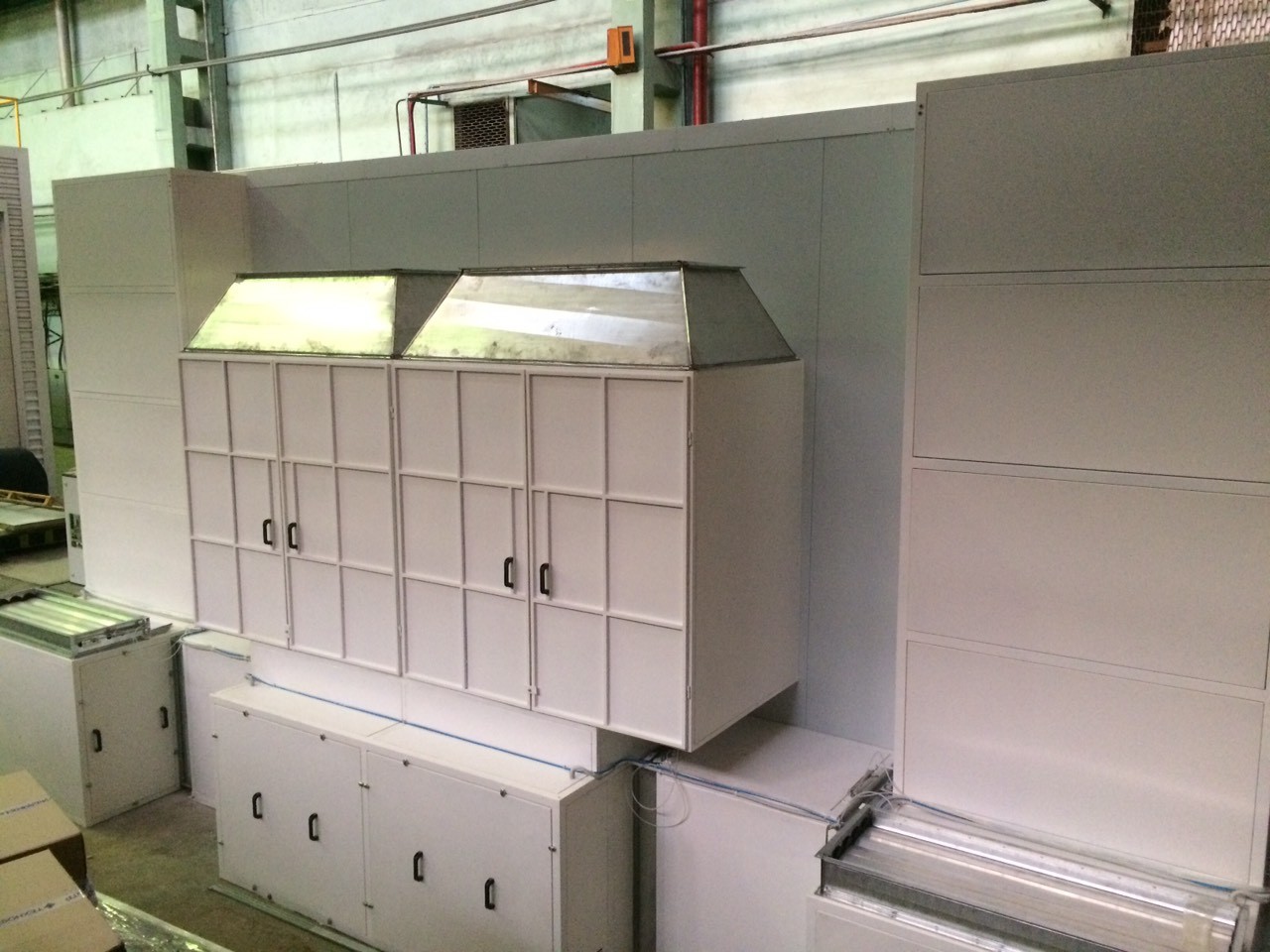 Воздух в камере нагревается с помощью двух мощных электрических теплообменников с толстопленочными металлокерамическими нагревателями собственного производства. Теплообменники имеют особую конструкцию, разработанную специально для применения в покрасочных камерах, с большим потоком воздуха. Благодаря этому, при относительно невысоких показателях расхода электроэнергии — от 30 до 90 кВт/час, они прогревают очень большой объем воздуха — 25 000 м³/час до дельты в 40°C. Кроме того, плавное регулирование мощности нагрева и точный контроль температуры позволяют обеспечивать небольшой перепад температур в работе камеры — ±5°C. Благодаря мощным теплообменникам камера без труда обеспечивает необходимые температурные режимы работы: нанесение покрытия — 20°C с перепадом температур ±4°C, а в режиме сушки — 60°C с перепадом температур ±5°C.