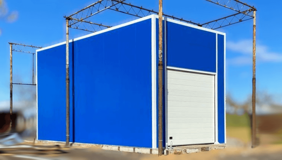 - Наличие ворот (4000×4000 мм) с дверью для персонала, противопожарного клапана, комплектов приточных и вытяжных воздуховодов, дымохода.