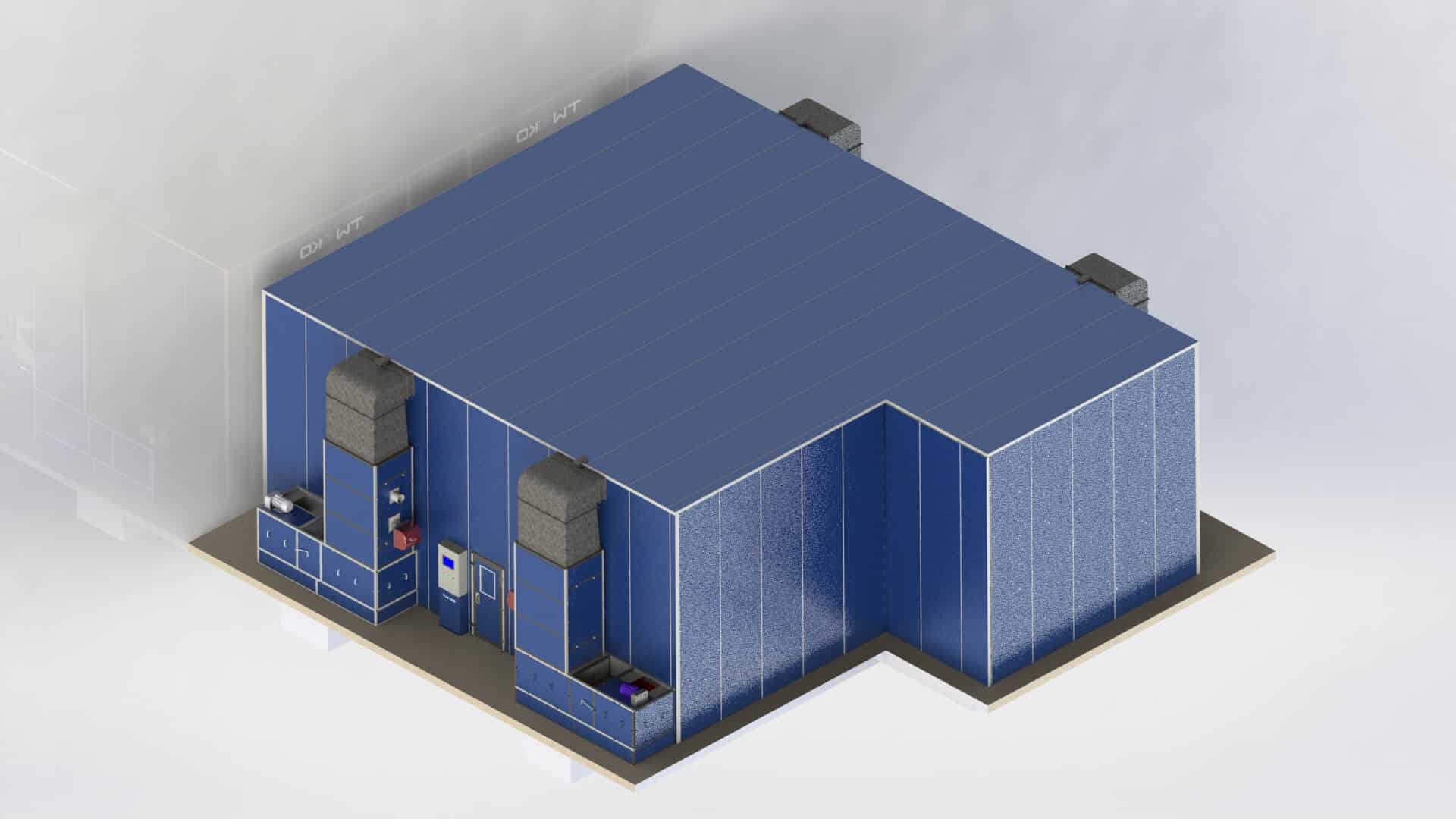 Окрасочно-сушильные камеры выполнены в виде металлокаркасных конструкций с тепло- и шумоизоляционным панельным ограждением, формирующим замкнутый рабочий объём с контролируемыми параметрами микроклимата. Такая конструкция обеспечивает стабильность процесса окраски и эффективную обработку покрытия на этапе сушки.