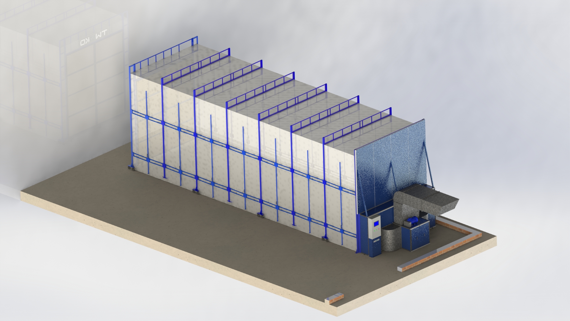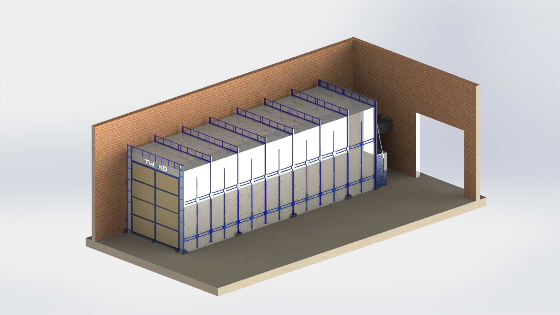В рамках проекта компанией TWEKO была изготовлена и внедрена телескопическая окрасочная камера на колесах серии MKF. Конструкция позволяет разворачивать кабину непосредственно вокруг изделия. Воздух подается через фронтальные фильтры, проходит через рабочую зону, захватывает окрасочный аэрозоль и удаляется вытяжной установкой через систему фильтров.
