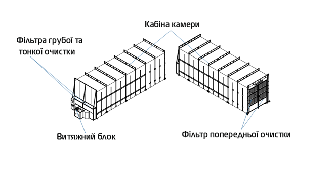 - Подача воздуха через фильтр предварительной очистки, прохождение через рабочую зону, захват окрасочного аэрозоля воздушным потоком и удаление через вытяжную установку
