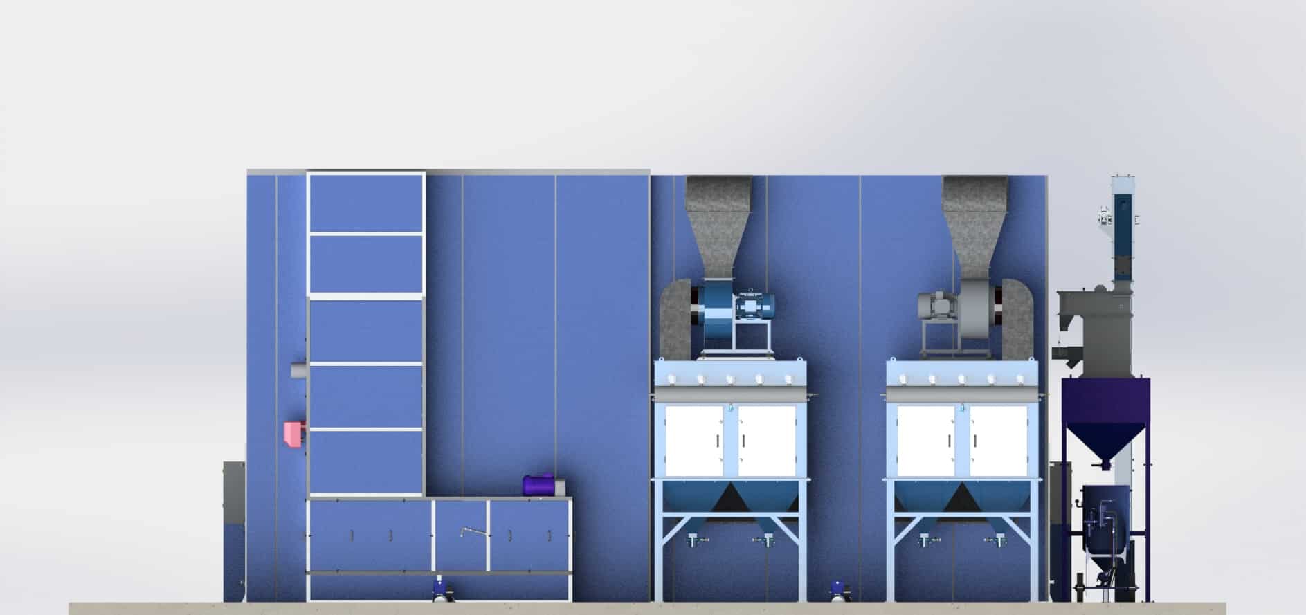 | Система регенерации | Сбор, очистка и повторное использование стальной колотой дроби (G25–G40) со скребковым полом, транспортером, сепаратором и бункером-накопителем. | Автоматизированная система регенерации воздуха с вентиляторами для диагонального потока (до 30000 m³/ч), фильтрами и рекуператором. |