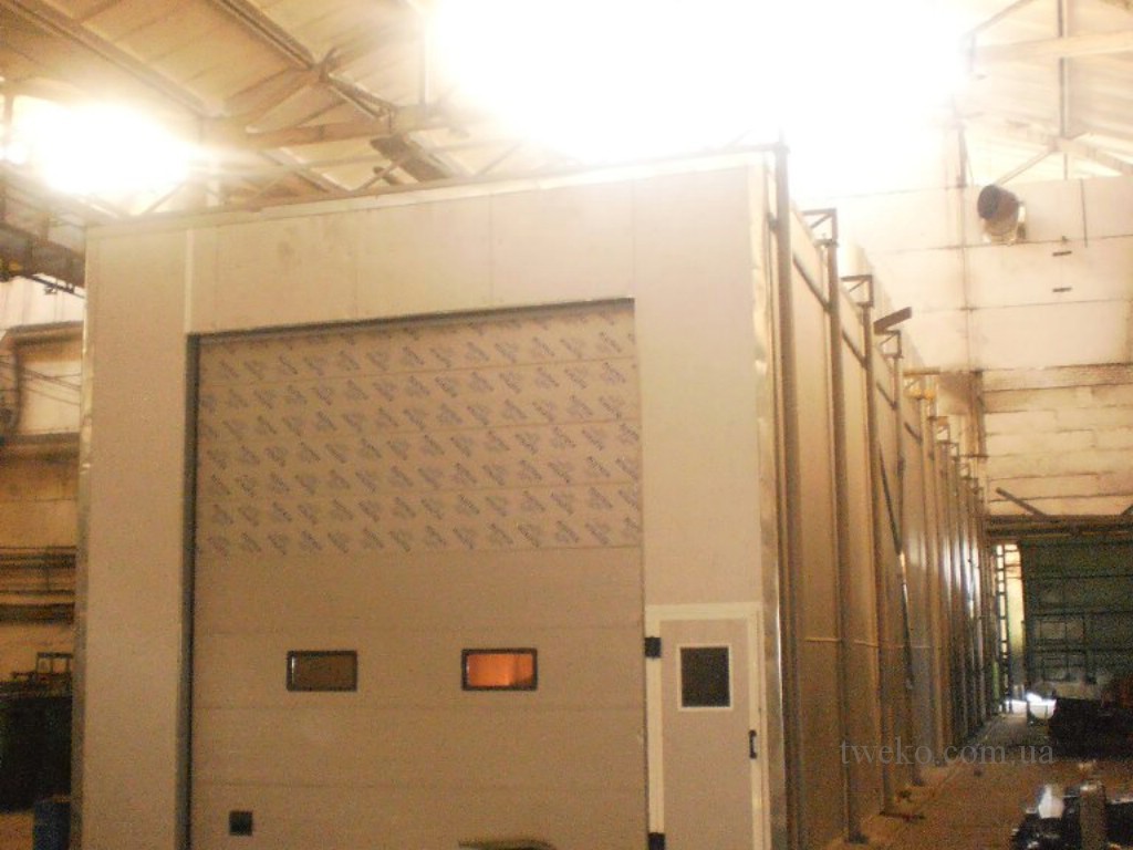 - Ворота и двери: Роллетные герметичные ворота размером 4000 × 4500 мм с теплоизоляцией и смотровыми окнами, а также три утепленные сервисные двери с замком «антипаника» для безопасной работы.