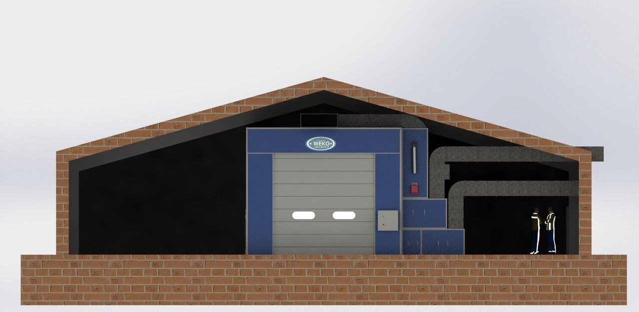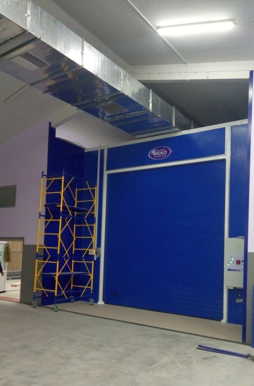 Одной из сложностей в реализации этого проекта стало ограничение по высоте помещения – 4680 мм, а в камере необходимо обеспечить возможность окраски изделий высотой до 4560 мм. Для решения данной задачи мы предложили первым делом создать углубление площадки на которой устанавливается камера на -300мм, что в комплексе со спущенными колесами на изделиях позволяет завозить в камеру радиолокационные установки, которые изготавливает заказчик. Расстояние можду кабиной окрасочной камеры и перекрытием малярного цеха составило всего лишь ~50мм.