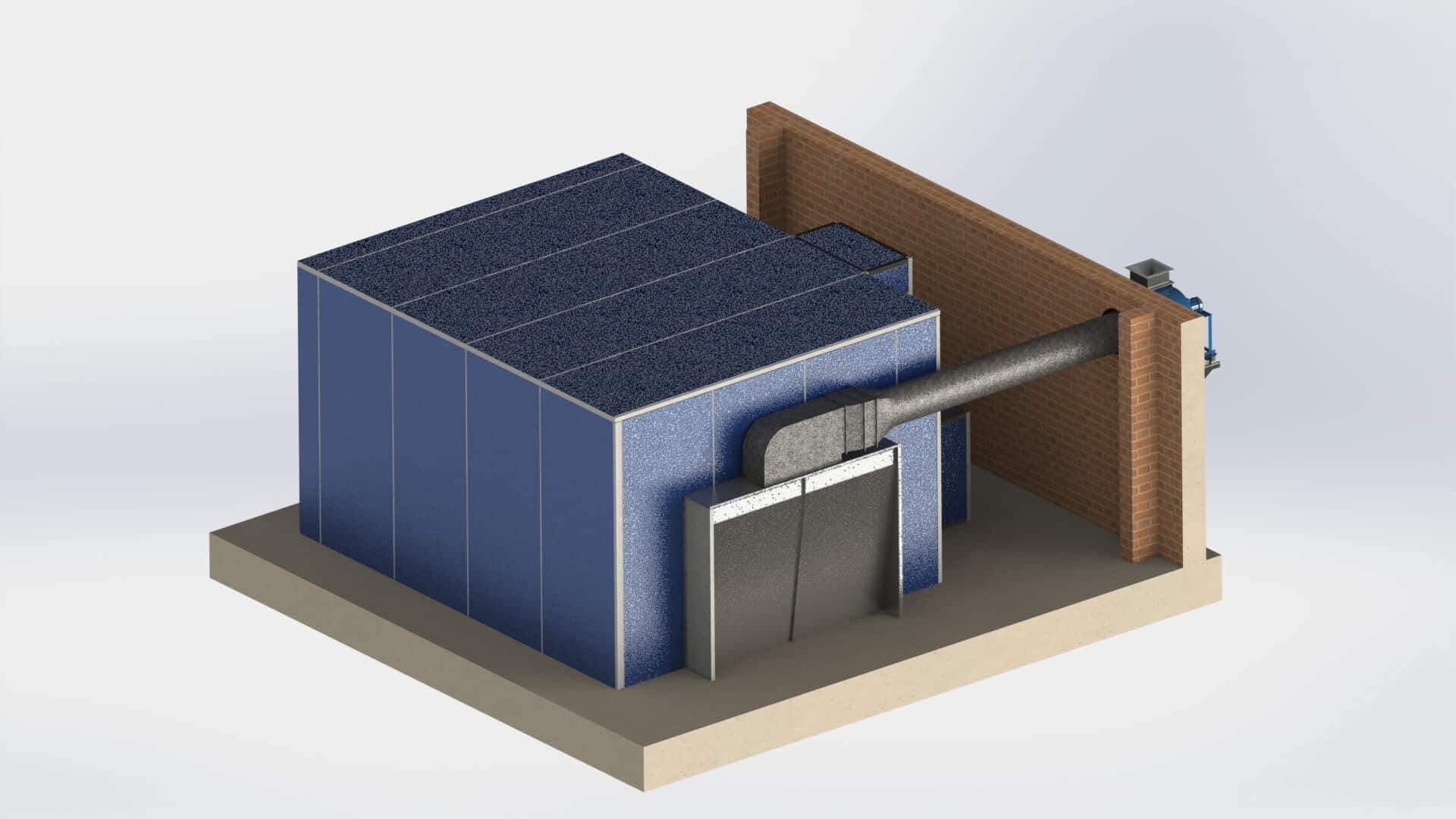 Было согласовано расположение термо-вентиляционной шкафа (ТВШ) и воздуховода выброса через окно, а команда TWEKO подготовила детальные чертежи для ключевых узлов — ворот (2400×2000 мм), вентиляционных установок (ВЦ 14-46 №5 и №4), шкафа АСС2,5, потолка, кабины и воздуховодов. Для теплообменника выбрали 24 оребренных ТЭНа мощностью 72 кВт, обеспечивающих равномерное распределение тепла, а ТВШ выполнили зеркально с выходом под ТЭН на сторону пульта.