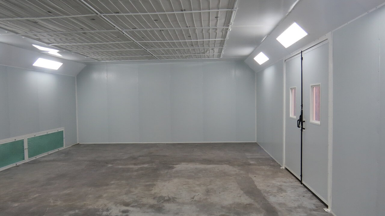 - Камера нанесения лакокрасочного покрытия: Размеры рабочей зоны — 12 920 × 6700 × 4000 мм. Термовентиляционная группа состоит из четырех термовентиляционных шкафов и комплекта обводных воздушных каналов. В сумме использовано восемь высокопроизводительных центробежных вентиляторов производительностью до 30 000 м³/ч каждый, что обеспечивает постоянный и равномерный воздушный поток со скоростью не ниже 0,3 м/с. Камера имеет собственные входные ворота и двое ворот для соединения с камерами обезжиривания и сушки.