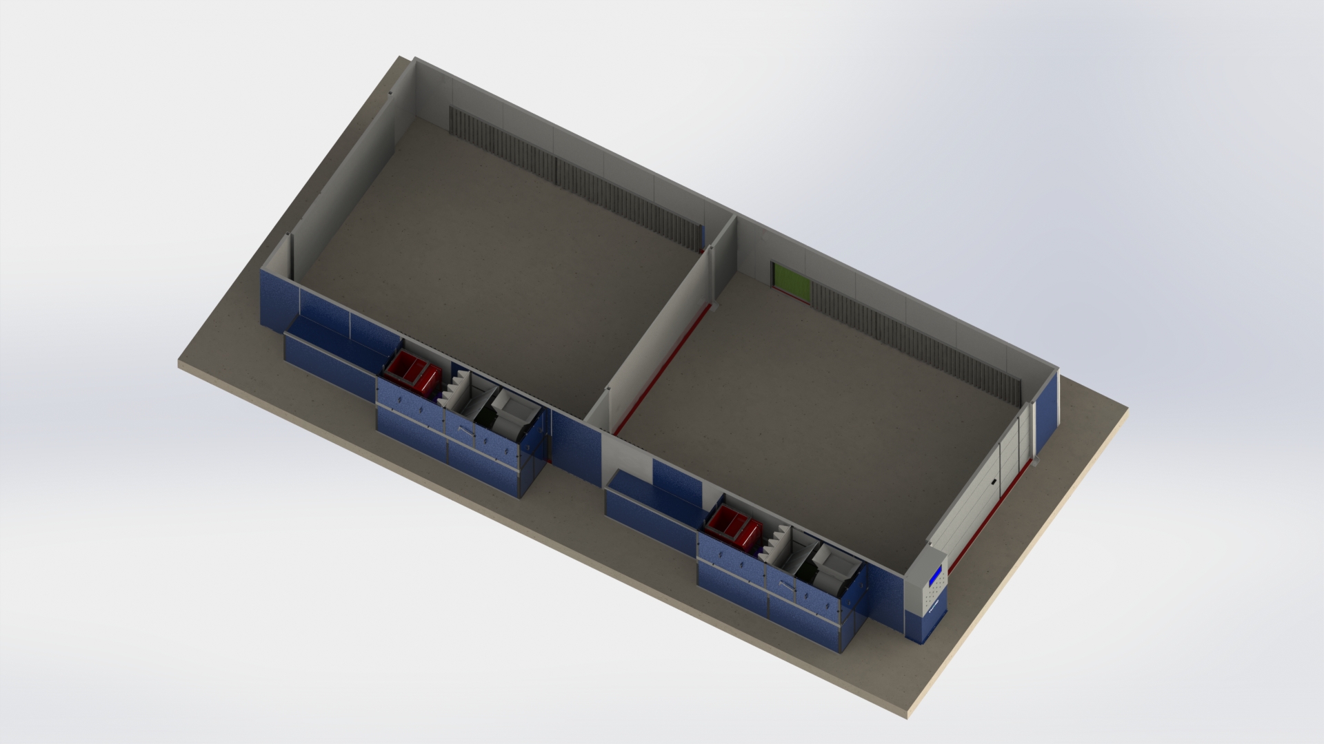 | Внутренние размеры (рабочая зона) | ≈ 11,0 × 6,5 × 5,2 м | ≈ 7,5 × 6,0 × 5,0 м (каждая зона) |