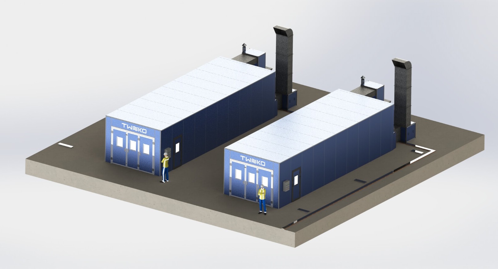 Вентиляционные камеры имеют внутренние размеры 12 000 × 4000 × 2800 мм. На фронтальной стене установлены герметичные утепленные ворота распашного типа с проемом 3200 × 2400 мм. Термовентиляционные шкафы расположены с тыльной стороны камер. Мощность приточных вентиляционных установок составляет 7,5 кВт, вытяжных — 5,5 кВт, что гарантирует эффективную циркуляцию воздуха в технологических боксах.
