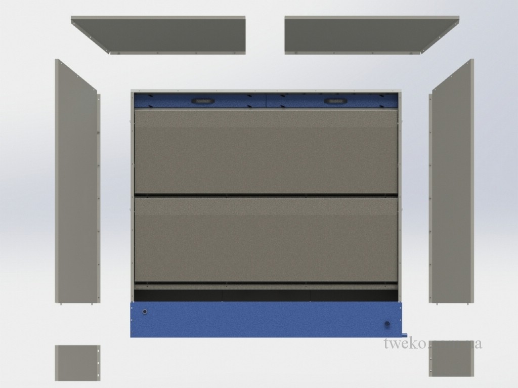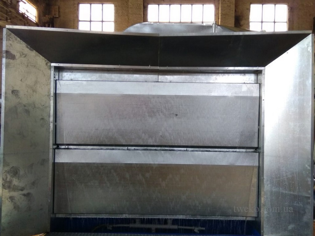 После начала работ лакокрасочное покрытие (далее ЛФП), которое не попало на изделие, захватывается воздушным потоком и направляется внутрь камеры. Часть ЛФП попадает на зеркала изделия, по которым тонким слоем стекает водяной поток. Вода захватывает частицы ЛФП и переносит их в ванну, где они накапливаются, смешиваются с водой и благодаря специальным коагулянтам собираются на поверхности. Вторая часть ЛФП, захваченная воздушным потоком, попадает во внутреннюю часть шкафа. В нижней части расположены форсунки гидравлической системы. Водяной поток от которых сбивает частицы ЛФП и вместе с водой попадают в ванну, где накапливаются. Остаточная часть ЛФТ (менее 5%) после прохождения лабиринта внутри шкафа задерживается стекловолоконным фильтром.