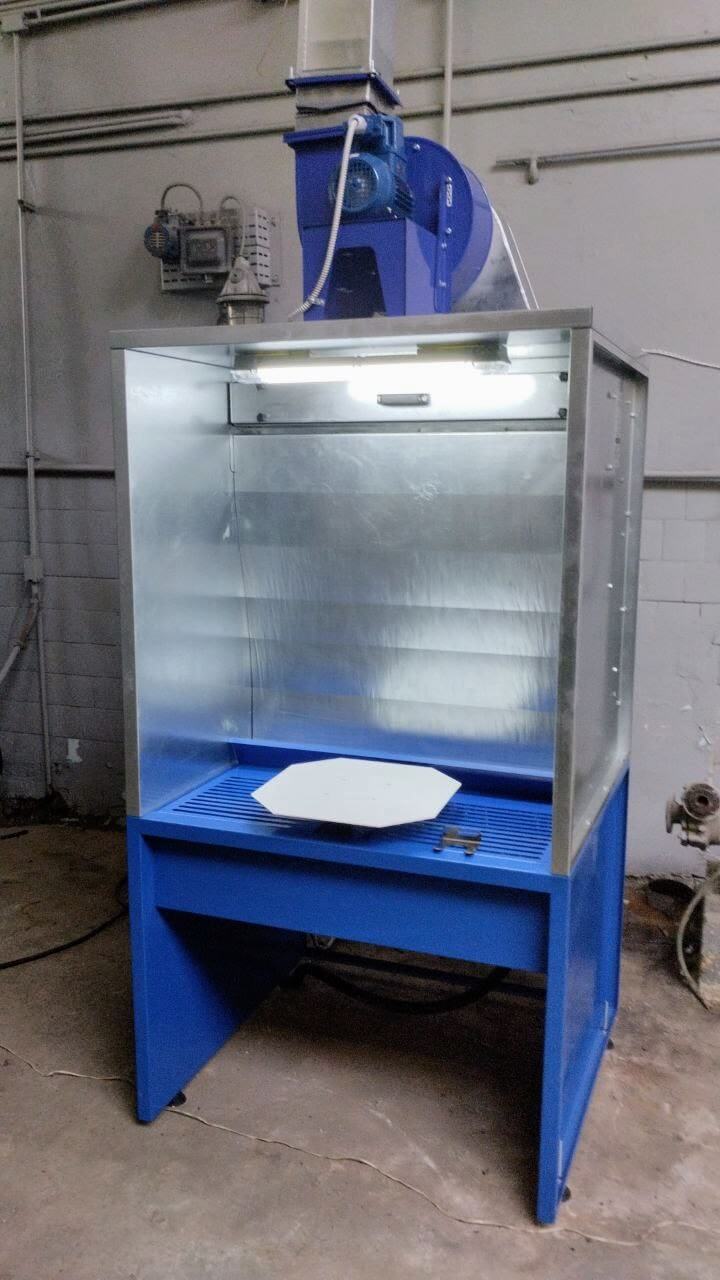 - Вытяжной шкаф AS Hydro (ASH-1). Оснащён водяной завесой (1×0,9 м) с трёхступенчатой фильтрацией (вода + Paint Stop EU4, очистка до 95%), взрывозащищённым вентилятором (2200 м³/ч, 1,98 кВт), водяным насосом (1,2 кВт, 200 л/мин) и герметичным LED-освещением (2×18 Вт). Шкаф интегрирован с коммуникациями заказчика (воздуховод 390 мм, канализация 50 мм, вода 3/4″ с шаровым краном) через гибкую вставку, переход и круглый воздуховод.