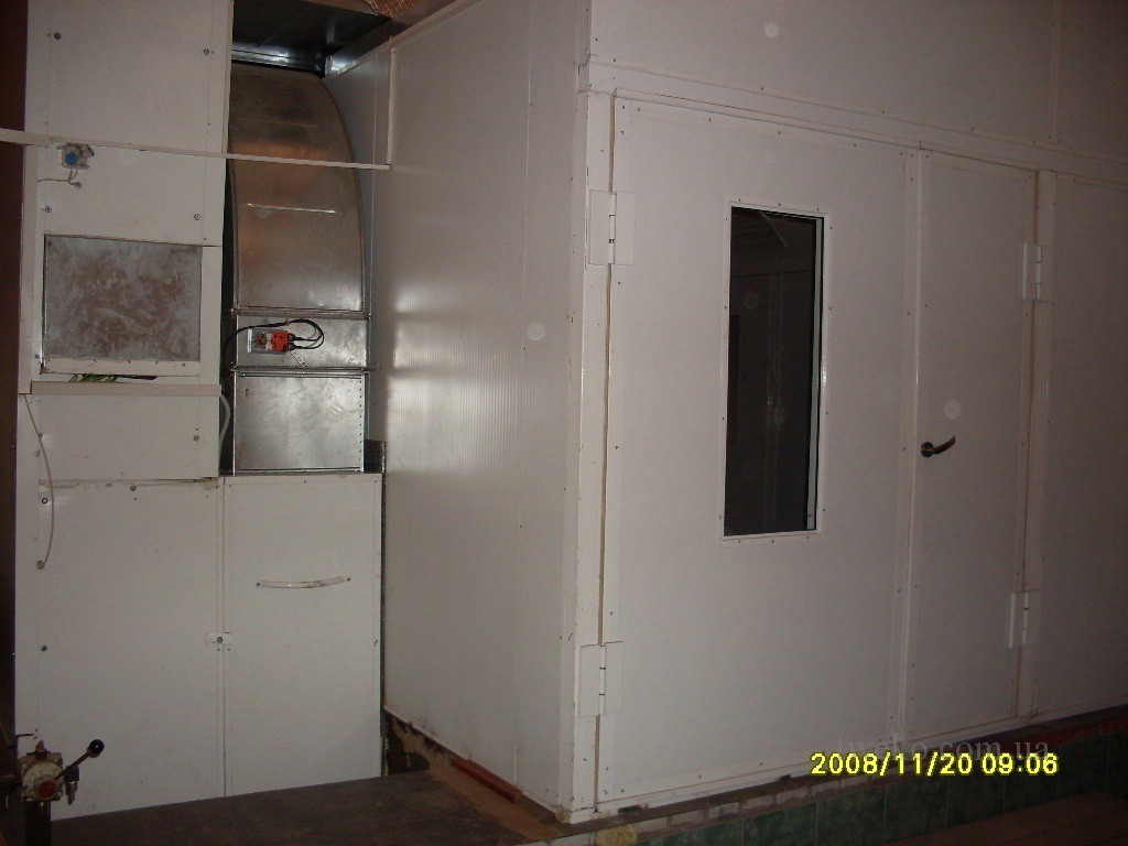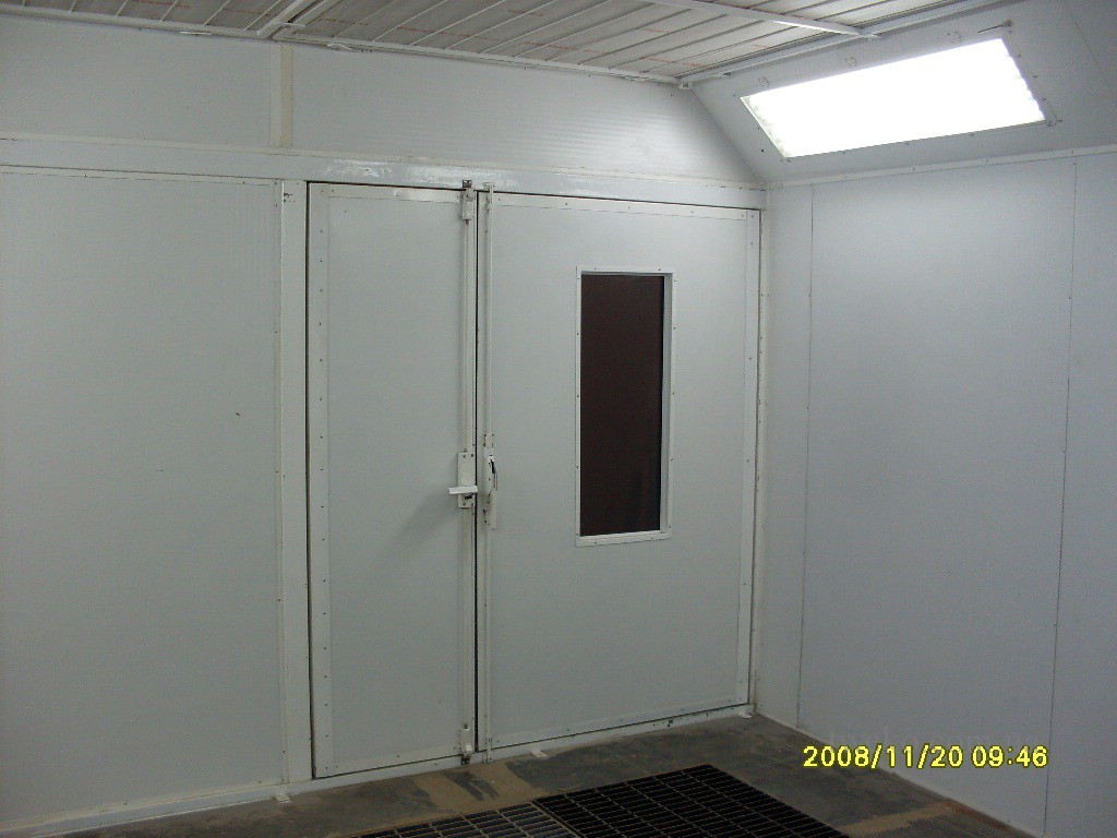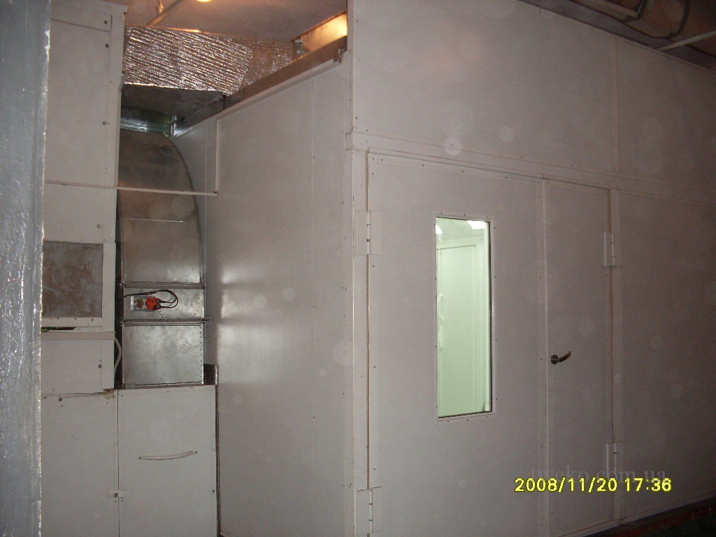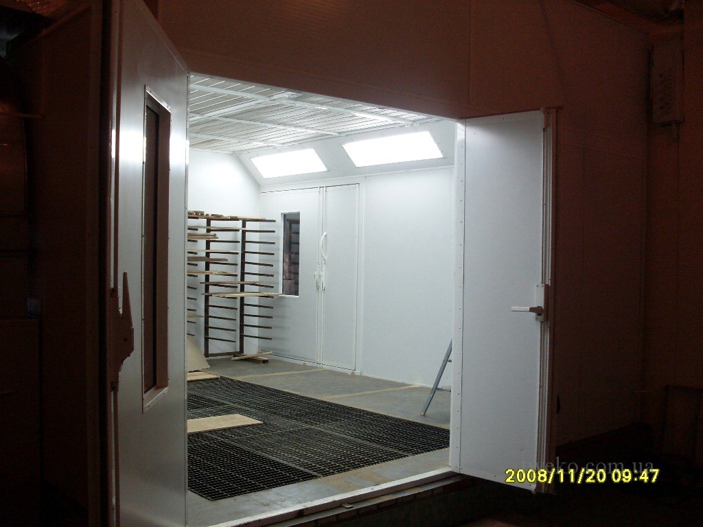 - Окрасочно‑сушильная камера, модель КП 05‑5100 (зав. № 31). Камера состоит из двух отсеков: окрасочного (5’090×4’000×2’500 мм) и сушильного (5’090×3’725×2’200 мм), изготовленных из сэндвич‑панелей (50 мм, огнестойкий наполнитель, гальваническое покрытие). Оборудована дизельным теплогенератором для нагрева воздуха (18–25°C для покраски, 50–70°C для сушки) и центробежными вентиляторами с высоким КПД (кратность обмена воздуха до 200 раз/час). Освещение предусмотрено в виде двух рядов герметичных люминесцентных светильников (4×40 Вт в окрасочном отсеке, 2×40 Вт в сушильном). Система фильтрации включает потолочные и напольные фильтры, а также предварительные карманные фильтры. Воздух отводится через каналы в бетонном фундаменте. Пульт управления с автоматикой обеспечивает контроль давления, температуры и режимов работы.